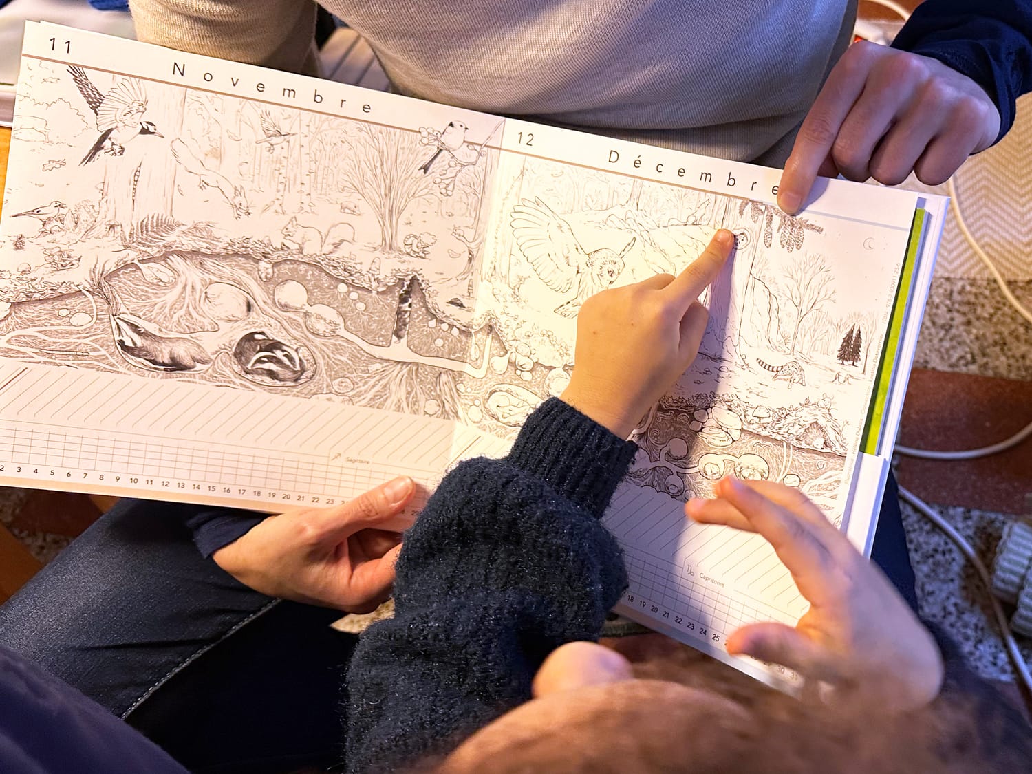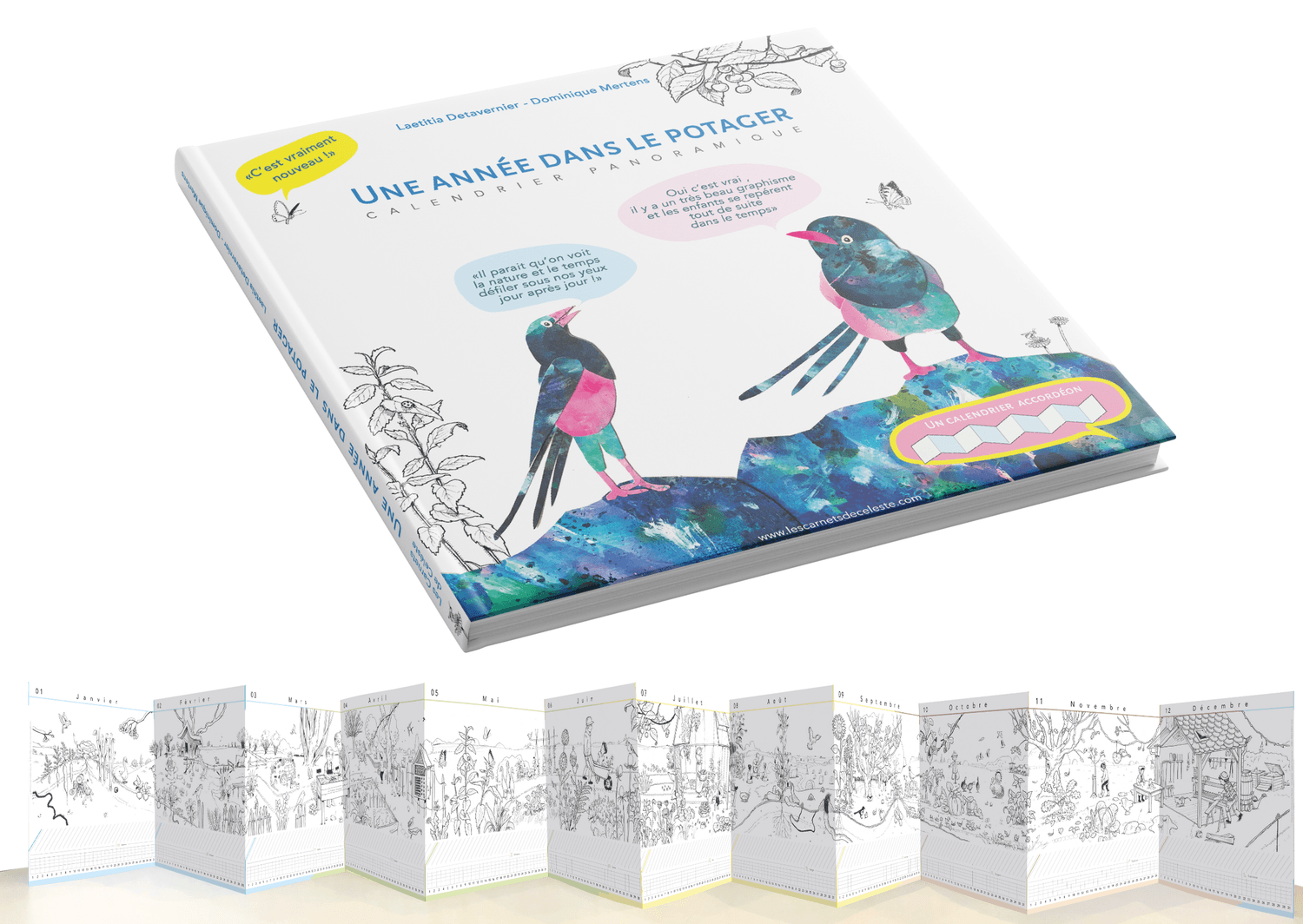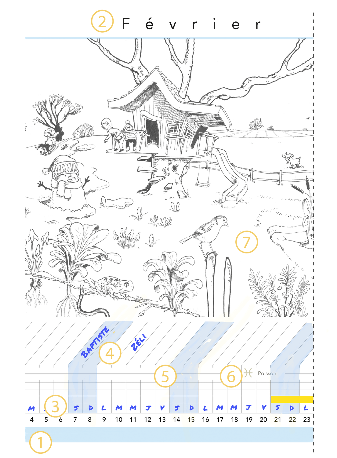 Ce qui est très original, c'est que les graphismes sont en noir et blanc donc on a vraiment toute la liberté de le remplir au fur et à mesure des mois. On peut découvrir le cycle de la lune, ce qui est assez rare sur les calendriers, donc si on est sensible, ça nous permet de sensibiliser les enfants aussi.