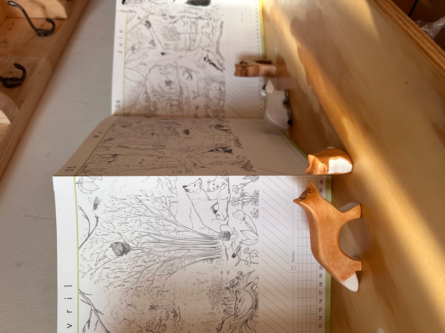 Le Calendrier Panoramique ouvert sur un meuble avec quelques figurines